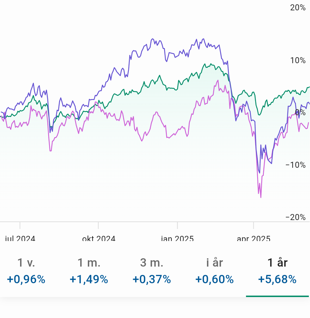 Lite utveckling i siffror jämfört med Plus Allabolag Sverige (rosa) och Storebrand Global All Countries (lila):