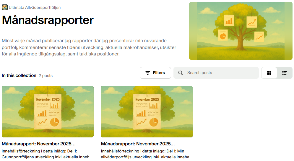 Minst en gång i månaden publicerar jag en rapport med genomgång av portföljernas utveckling samt sentiment- och makroanalys för alla tillgångsslag.