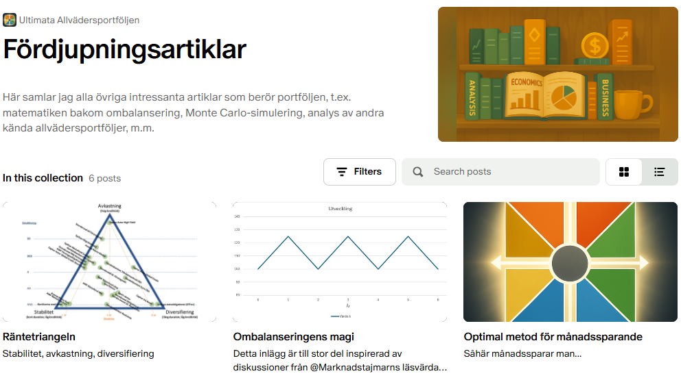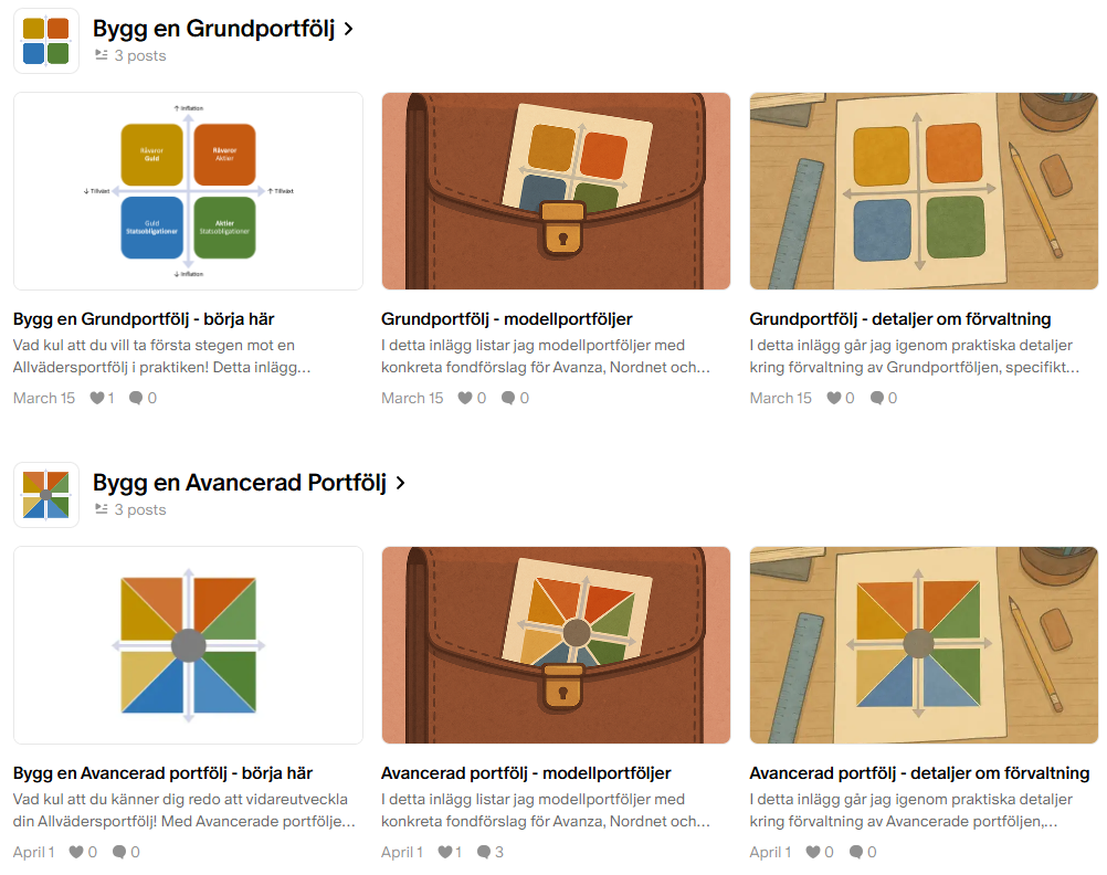 Förenkling av denna tråd. Jag har insett att omfattningen på mitt första inlägg och tråden i sin helhet har blivit så massiv att den snarare riskerar att skrämma iväg nybörjare än att väcka intresse. Genom att flytta Avancerade portföljen till Patreon kan jag renodla fokus här på forumet mot Grundportföljen. Min förhoppning är att det ska göra tråden mer tillgänglig för alla.