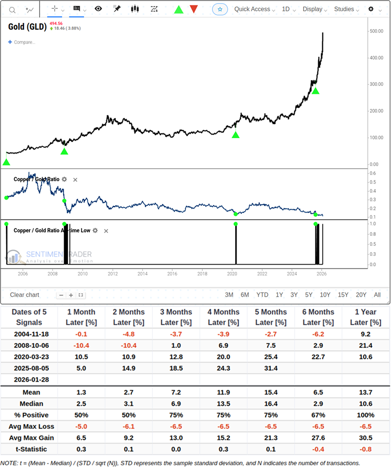 Utveckling av guld efter att koppar/guld-kvoten nått ny all-time-low. Källa: Sentimentrader.com.