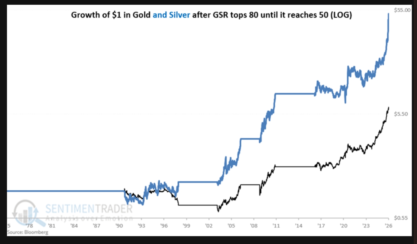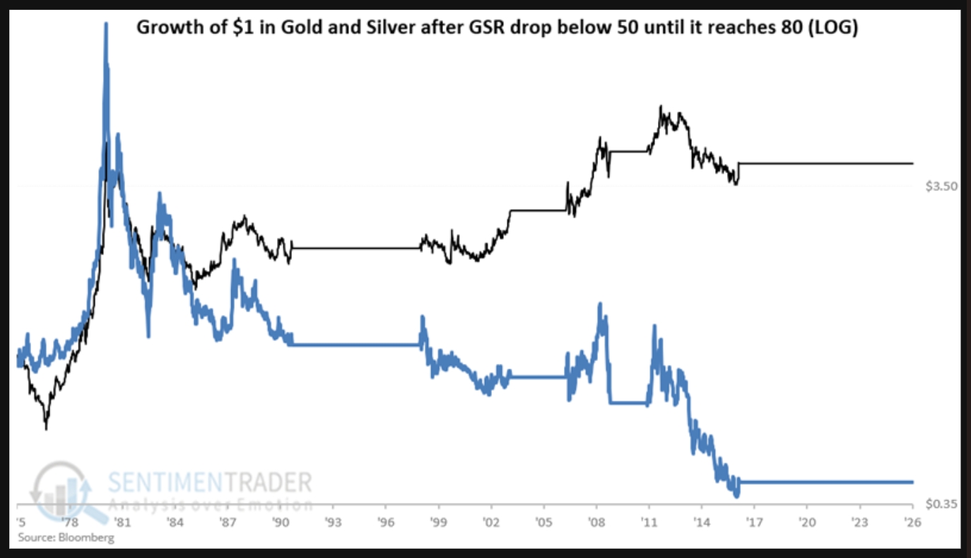 Skillnaden blir tydlig när man jämför utvecklingen med att äga silver istället för guld när kvoten legat över 80, vilket varit fallet under hela 2025, och silver steg mycket riktigt med >100% under året.