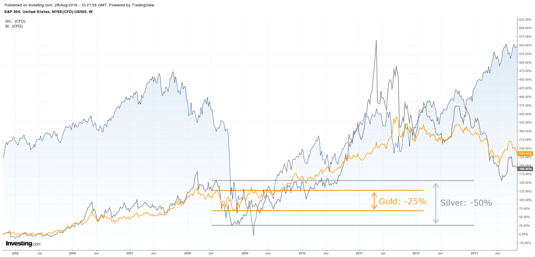 Utveckling av guld och silver under finanskrisen 2008. Källa: Egen graf via Investing.com.