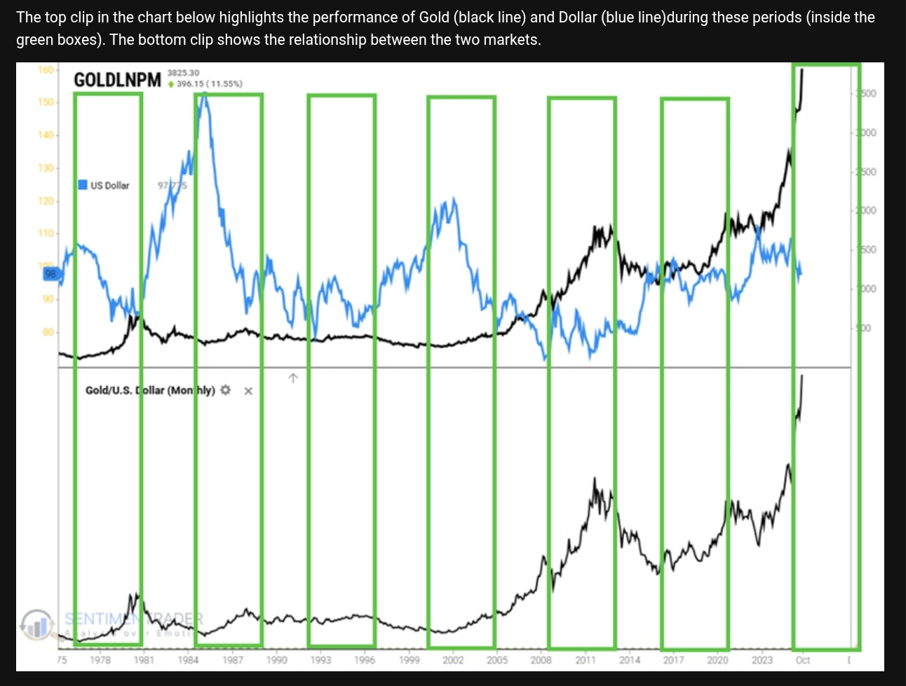 Sekulära 4-års cykler för guld. Vi ser att guldpriset (övre grafen, svart linje) tenderat att gå 4 år plus följt av 4 år minus/sidledes. Aktuell period 2025-2028 är en positiv period. USD (blå linje) uppvisar motsatt förhållande. Källa: Sentimentrader.com.