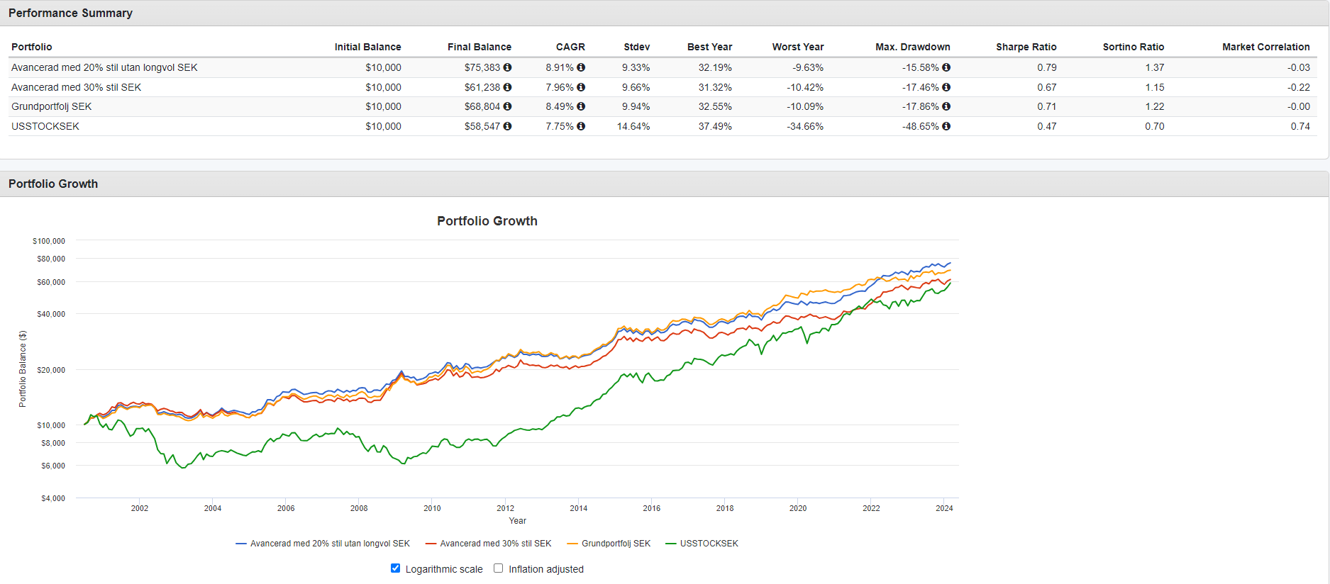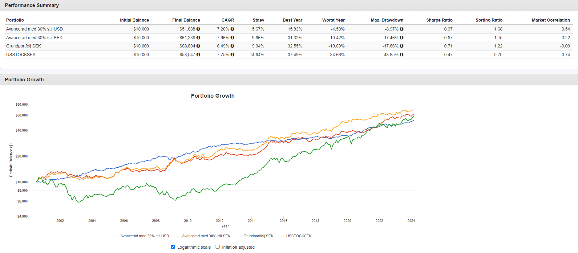 Detta är kanske den viktigaste nyheten, eftersom det är utvecklingen i SEK som syns i våra konton och drawdowns i SEK som påverkar våra belåningsgrader vid portföljbelåning. Tidigare backtester har alltid redovisat utvecklingen i USD.