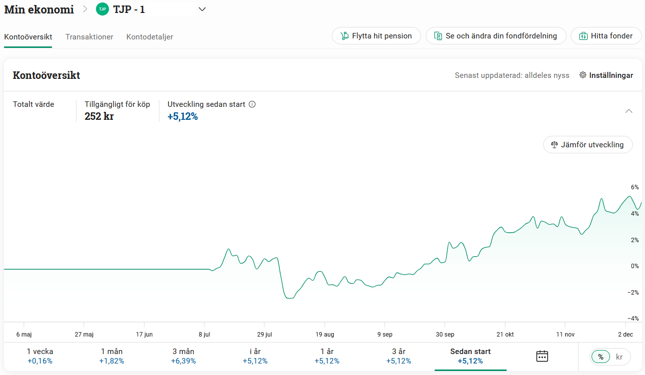 2024: ca +1,95 % Skandia Trad fram till flytten i mitten av juli, ca 5,04 % över cirka 5 månader efter flytten (10/7 – 8/12) får jag det till
