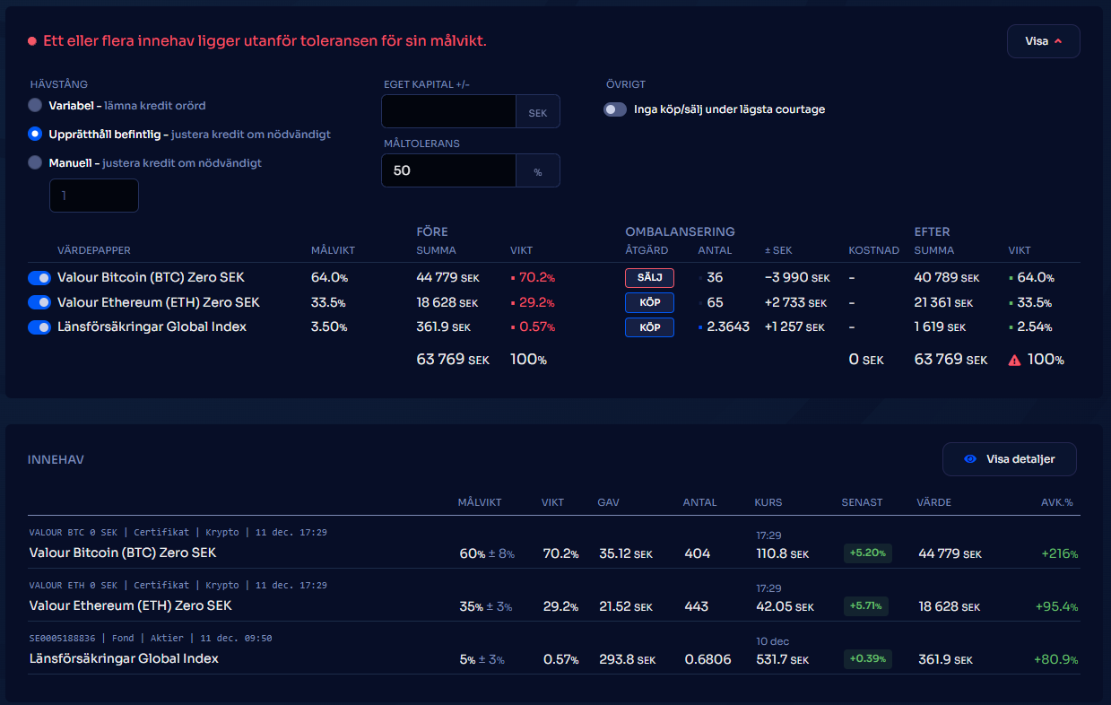 I exemplet nedan har Bitcoin en målvikt på 60 ± 8% och en nuvarande vikt på 70.2%. Med måltolerans inställd på 50% så ombalanseras den istället till 64%.