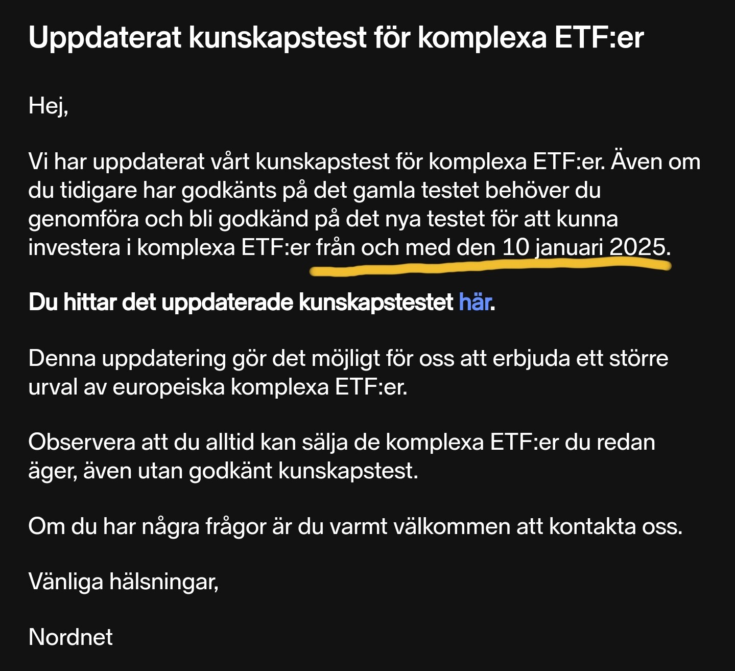 Jag har tittat närmare på vilka av mina konton som fått meddelandet från Nordnet. På det minst komplicerade kontot har jag utöver vanliga fonder enbart guld-ETC:er. De konton som inte innehåller några ETF-liknande värdepapper har inte fått meddelandet.