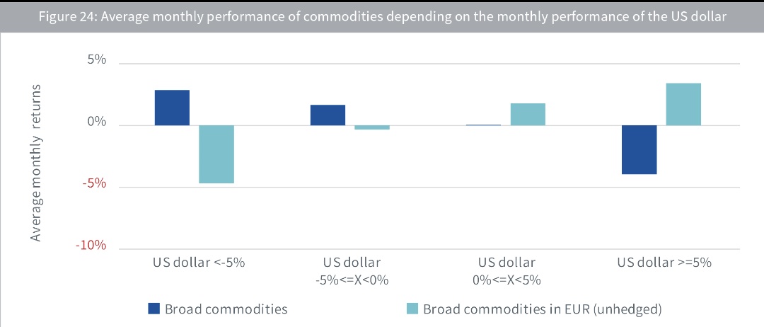 Valutaeffekt kan förstöra diversifieringen som råvaror erbjuder. Se figuren nedan där vi ser att råvaror har tydlig negativ korrelation till USD, men för en EUR-investerare kan effekten bli motsatt! Råvaruterminerna prissätts ju i USD, och perioder av inflation hänger ofta ihop med minskande värde på USD.