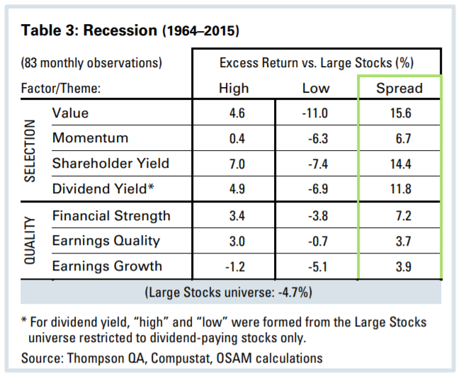 Som man kan förvänta sig kommer de fram till att värde och även hög shareholder yield (utdelningar + återköp) presterar relativt bra runt nedgångar.