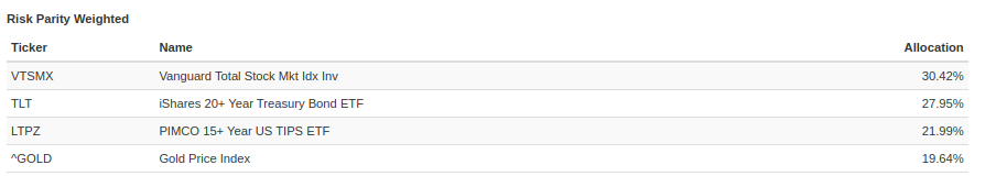 @Marknadstajmarn poäng var dock bara att visa att min grundportfölj kan uppnå riskparitet med 25/25/25/25-fördelning, tack vare att räntorna är långa. De tickers som användes i testet var inte någon köprekommendation.