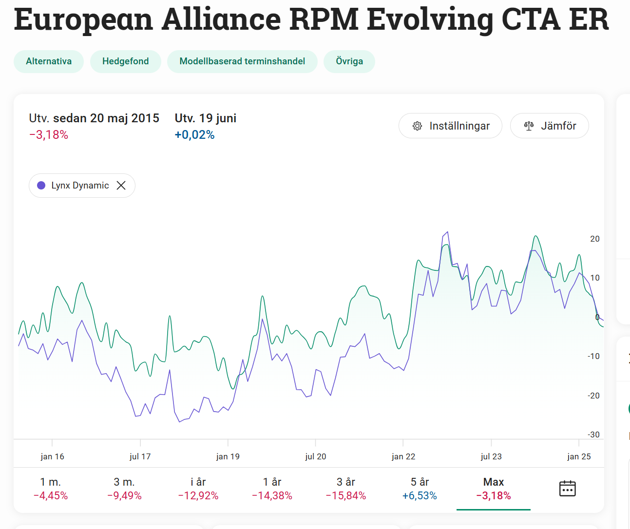 Men graferna berättar en historia som såklart inte nödvändigtvis reflekterar framtida prestanda. När man kollar hur den har gått jämfört med Lynx Dynamic (som jag redan sparar i) är det faktiskt inte så illa, avgifterna till trots. Gröna i bilden är RPM fonden, lila är Lynx Dynamic: