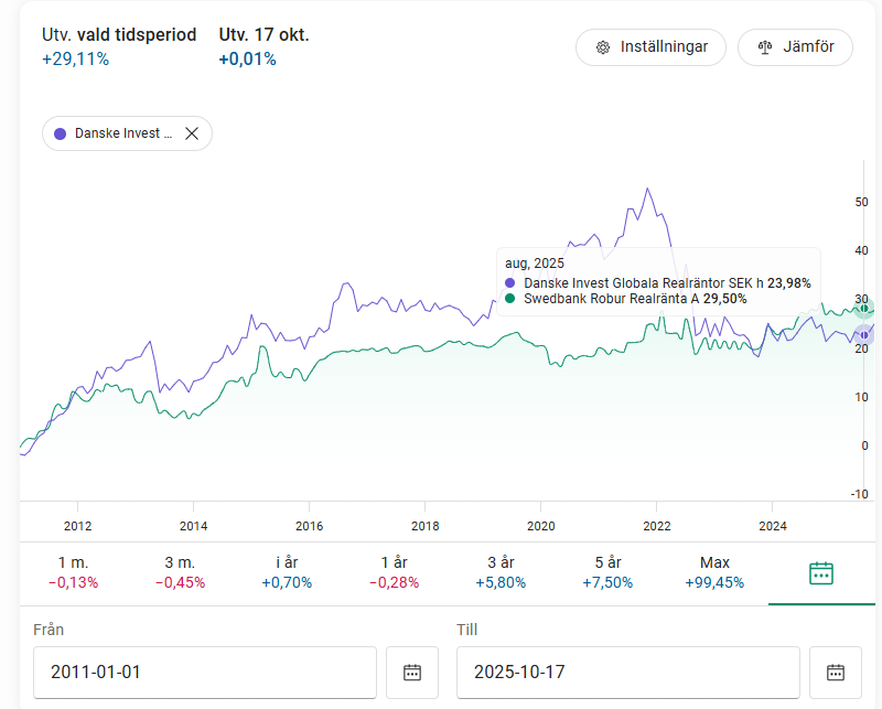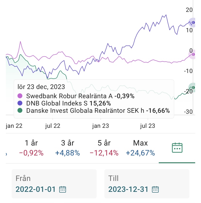 Tittar man på senaste inflations perioden 2022-23 så känns det som om Swedbank Realränta bara hade agerat ballast. Min tolkning är att inflationsboosten åts upp av ränteuppgången även med den kortare durationen. Danske Global Realränta var ju dock helt katastrofal med -16% pga den längre durationen.