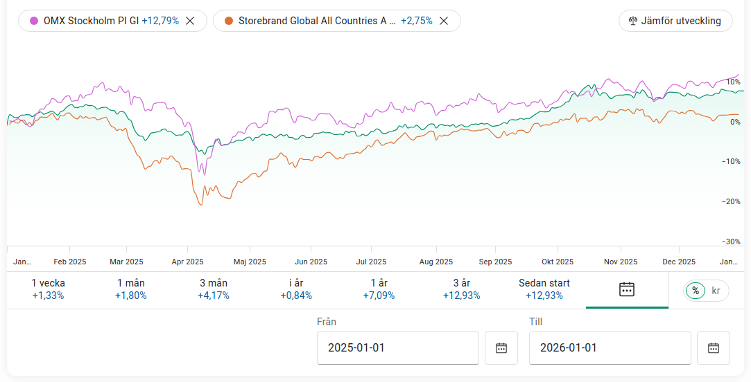 Hade annorlunda fördelning från min start sent i februari och t.o.m. Liberation Day. Tror jag låg på 36% aktier eller något sådant och motsvarande i guld (numera 28%) med en förenklad avancerad portfölj utan stil exempelvis. Klarade USD/SEK-fallet i mars hyfsat då jag fyllde på i Trumpdippen och ännu inte hade handlat ETF-er i USD. I november gick jag över helt till den avancerade varianten. Flyttade en del tillgångar till en annan bank i december som ju var en stark aktiemånad.