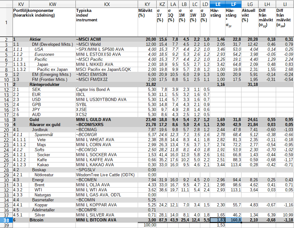 Samtidigt har jag respekt för att min metod inte nödvändigtvis är den bästa. Vill du använda mer aktuell volatilitet för viktning så kör på det, men se bara till att göra det metodiskt och var beredd på att överraskningar kommer ske.
