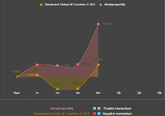 Motsvarande siffra för min allvädersportfölj är +15,49 %, vilket är 4,83 %-enheter mer.