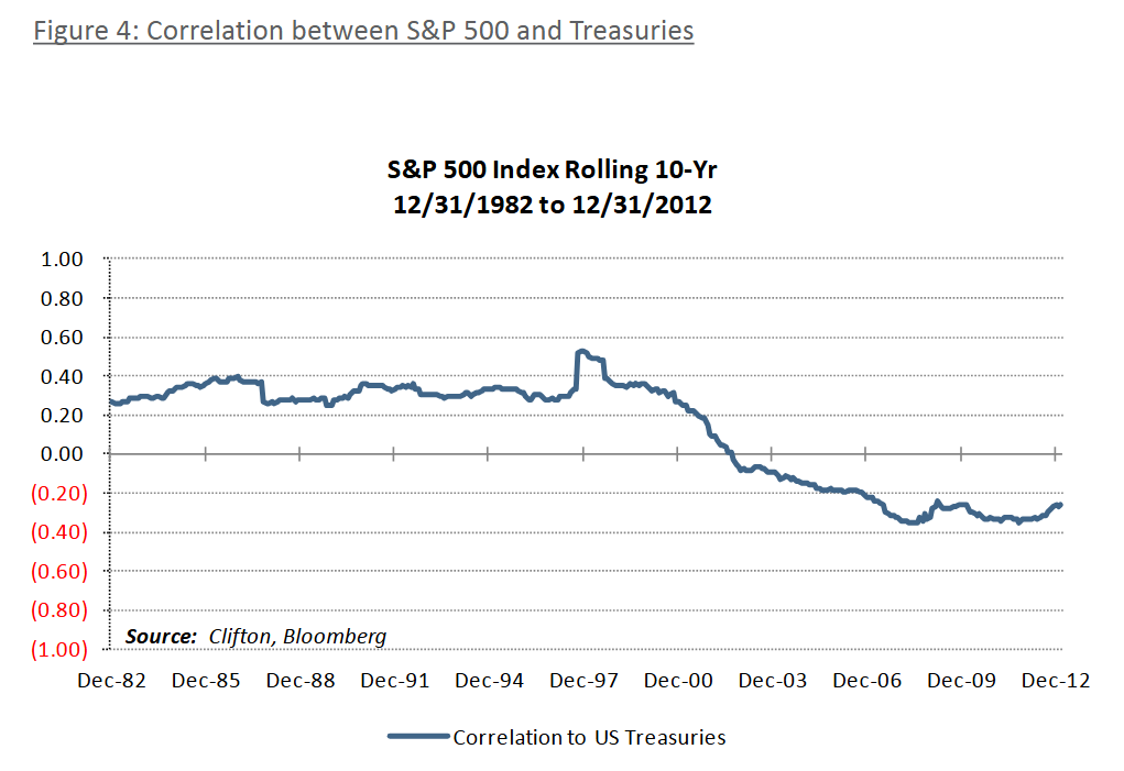 Correlations provide another point of differentiation between risk parity strategies. Figure 4 shows the rolling correlation between the S&P 500 and US Treasuries. As this chart illustrates, correlations are not stationary. In fact, asset class correlations change dramatically through time. A risk parity manager must carefully consider correlations between various asset classes in constructing a diversified portfolio. As Figure 4 demonstrates, static estimates of correlations are problematic. Forecasting future correlations is a complex exercise that is fraught with challenges.