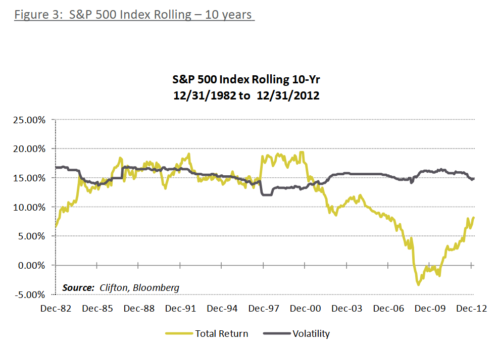 Constructing a portfolio based on risk and diversification benefits requires measuring an asset class’s risk and its correlation to other asset classes. The normal measure of risk for an asset class is its annualized standard deviation of returns over some defined period. There is a decision to be made, however, with respect to the appropriate time period over which to measure the standard deviation. A short-term measure of risk may capture changes in risk regimes, but is dependent on the manager selecting the correct time frame. As Figure 3 illustrates, a long-term measurement of risk will miss these short-term changes in risk regimes, but should lead to a more accurate measure over time, as volatility is mean reverting. Choosing an appropriate time period for measurement depends on how the investor thinks of the portfolio. An investor looking for a tactical strategy with a component of active risk will be more open to an approach that measures risk over shorter time horizons. Conversely, an investor seeking a strategic investment approach with minimum active risk will gravitate towards strategies that measure risk over longer periods.