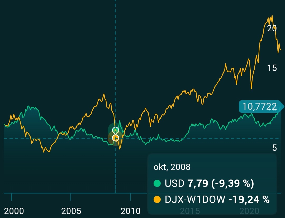 Jag har länge tänkt att USD är ett perfekt komplement till aktier. Växer mot SEK (och de flesta andra valutor) på sikt och fungerar som krockkudde vid krasch/korrektion.