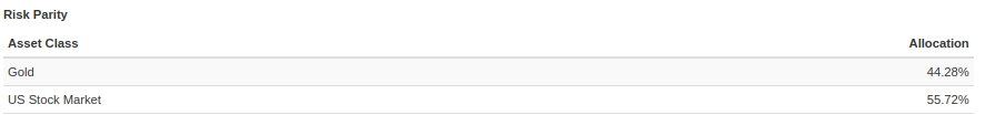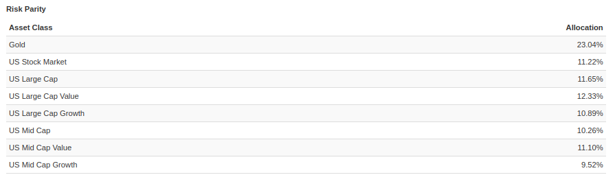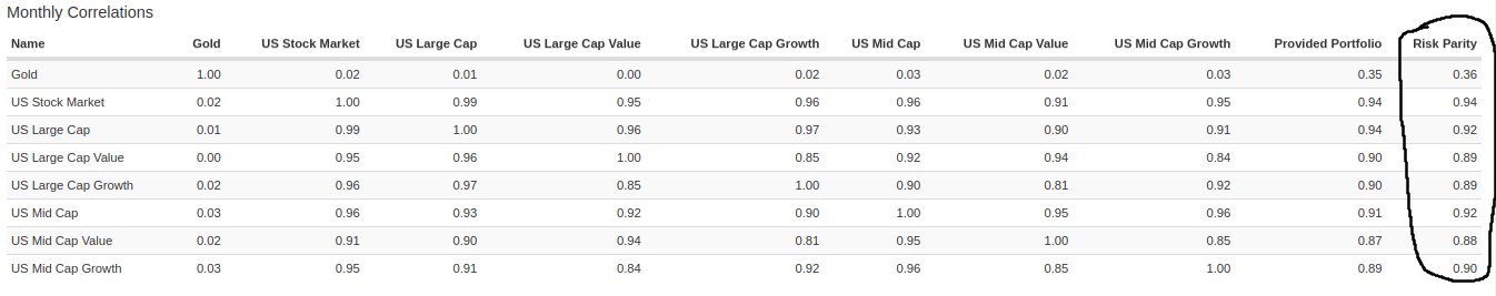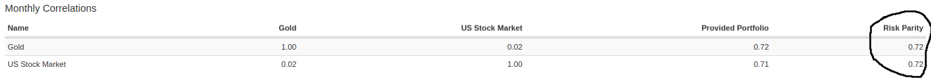 PV verkar dock optimera på någon annan parameter, har ingen aning om vilken. Den verkar gå mer på enskilda tillgångars volatilitet precis som @1havde skriver, men samtidigt verkar den även ta viss hänsyn till korrelation, annars borde ju guldet ligga kring 10% allokering i exempel 2.