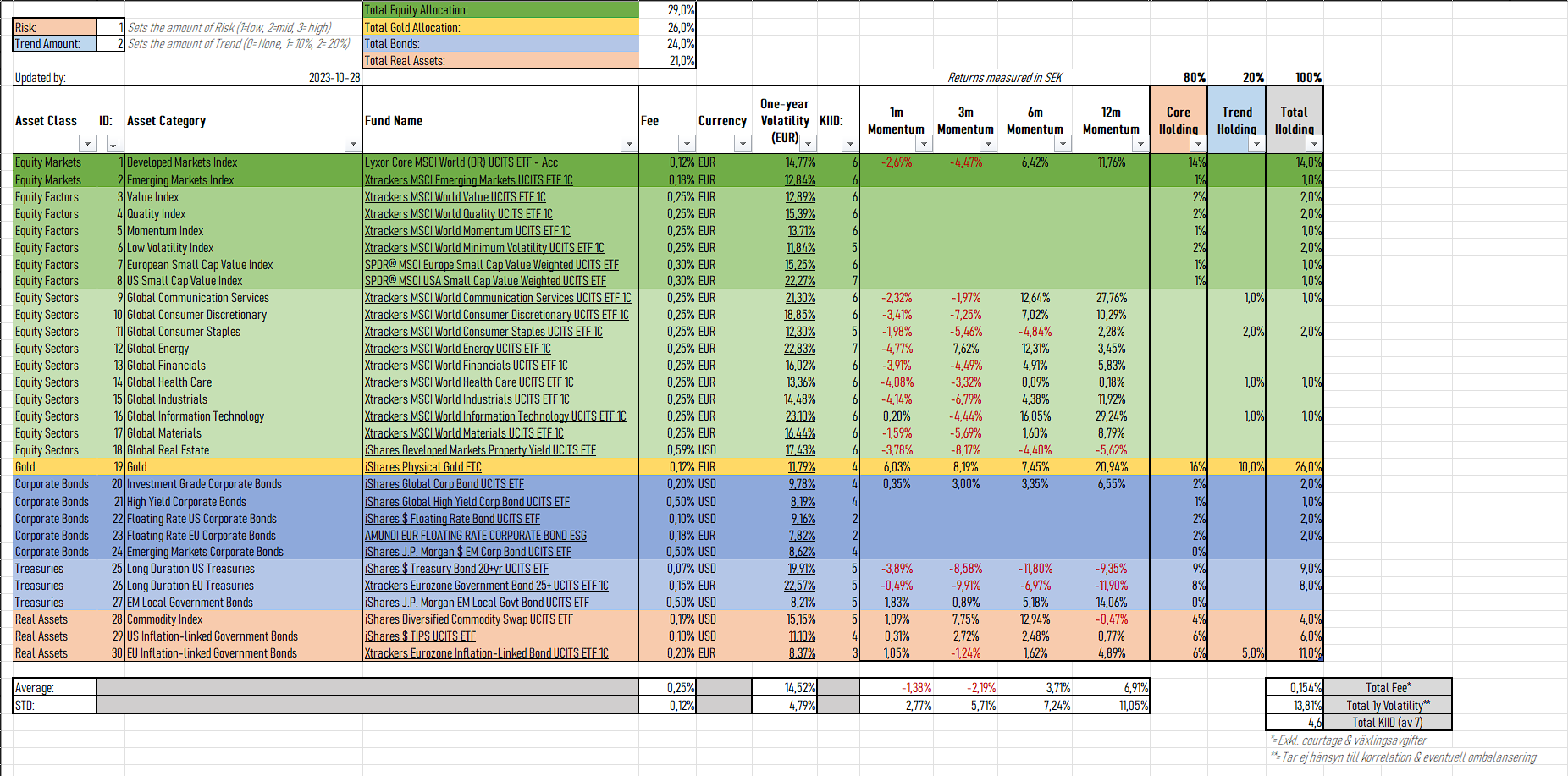Grundportföljen ursprungsläge: 30% aktier, 20% statsobligationer, 20% realränteobligationer, 30% guld