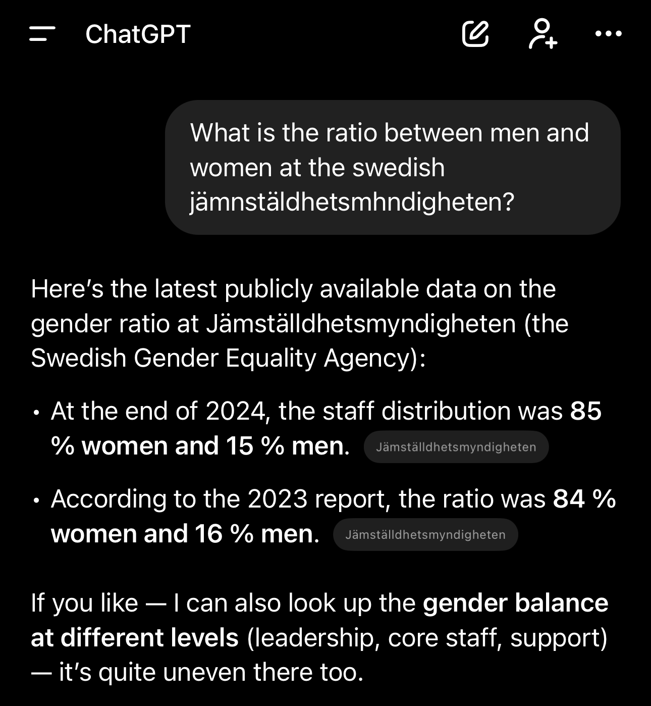 Vad är inte relevant med min första fråga? Det klagas ju hela tiden på att det är för få kvinnor här och där, och att målet är runt 50/50 ratio kvinnor och män på alla arbetsplatser. Dvs det är deras tolkning av ordet ”jämnställdhet” jämfört med engelskans ord ”equity”. Så om det är jämställdhetsmyndighetens mål att hela samhället ska se ut så, varför klarar inte de själva av det på sin egna arbetsplats? De borde vara föregångare om någon. Jag tycker frågan är relevant pga hyckleriet.