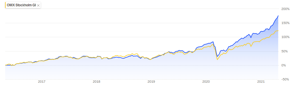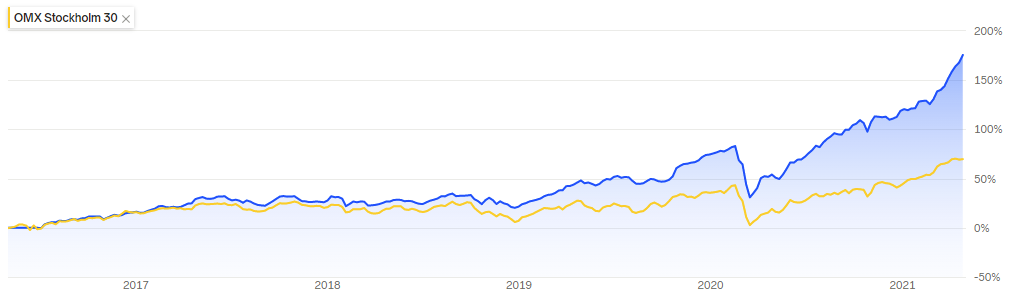Det är mest ett försök till “köp och håll för alltid”, lärdom utifrån att ha dummat mig och sålt Investor för tidigt för många år sedan enligt bilden nedan. Vad den dessutom inte visar är att Investor var min första aktie 1996 tillsammans med Bure. Men då var jag ung och dum. ![]()