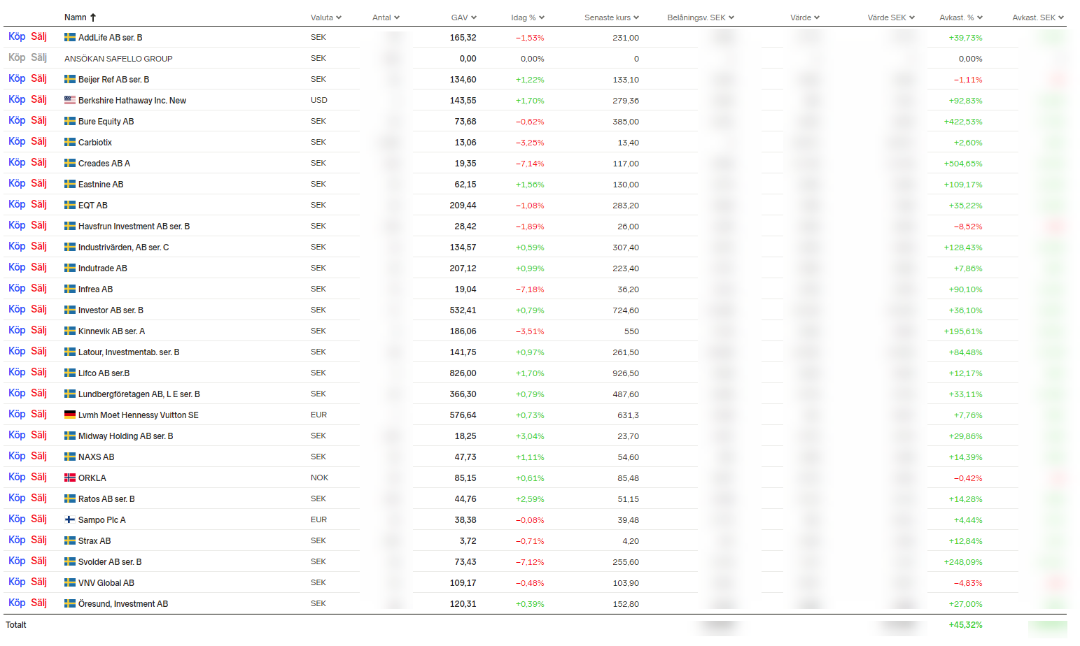 Min tanke är att vid tillfälle försöka balansera på marknadsvärde. Men det får komma senare. Här är utvecklingen just nu: