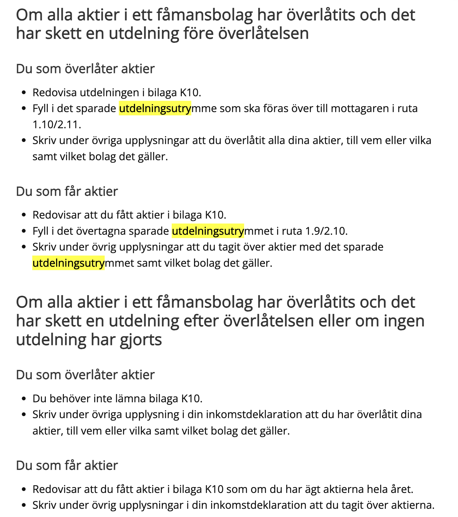 Jag har hittat nedan på Skatteverkets hemsida, men tycker fortfarande förvirring kvarstår, särskilt vad gäller att ha kvar utdelningsutrymmet.