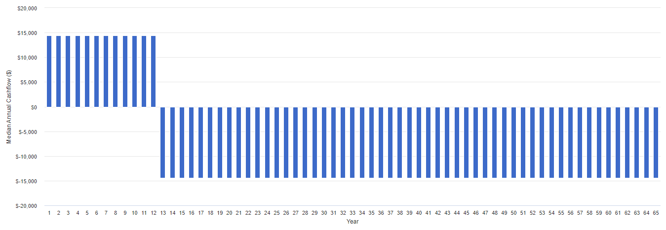 Tycker att det är fullt godkänt att det fungerar med uttaget i 30 år i 90% av fallen och i 65 år i 86% av fallen. Kanske inget man hade satt livet på, men som illustrativt exempel absolut. För tydlighetens skull så här ser insättningar vs uttag ut.