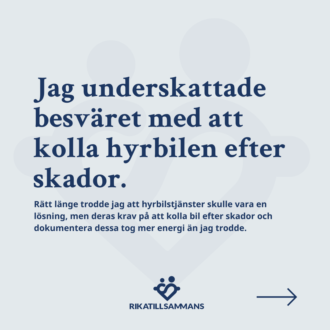 Vi har provat nĂ„gra korttidshyra och det lĂ€t som en bra lösning initialt, men jag underskattade att min oros-personlighet skulle ta âGĂ„ ett varv runt bilen och kolla efter skador och jĂ€mför med bilens skadeloggâ-instruktion vĂ€ldigt bokstavligt och det tog ifrĂ„n rĂ€tt mycket av upplevelsen av smidighet. LĂ€gger man pĂ„ sjĂ€lvriskreducering sĂ„ blir det rĂ€tt dyrt.