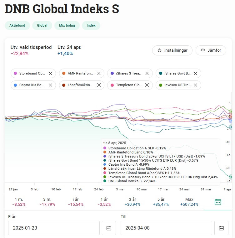 Det jag undrar är om någon känner till några bättre räntebärande produkter, som uppfyller syftet att vara stabiliserande för portföljen (dvs. motverka nedgången och växeldra med aktiedelen) i ovanstående marknadsförhållanden. Jag antar att det jag är ute efter är att hitta den räntebärande produkt som har gett bäst avkastning, mätt i SEK, under perioden 23/1-8/4 i år.