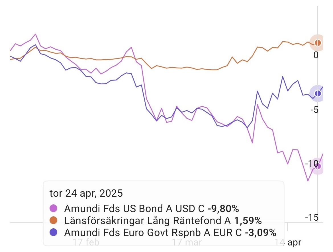 Kanske lämpar sig långa räntor bättre för längre/djupare nedgångar än den korta dipp vi sett senaste tiden? Typ då man går in i en recession. För att kunna stabilisera portföljen vid kortare nedgångar kanske det är bättre att satsa på andra tillgångsslag än räntebärande produkter. Någon med insikt får gärna utveckla detta närmare.