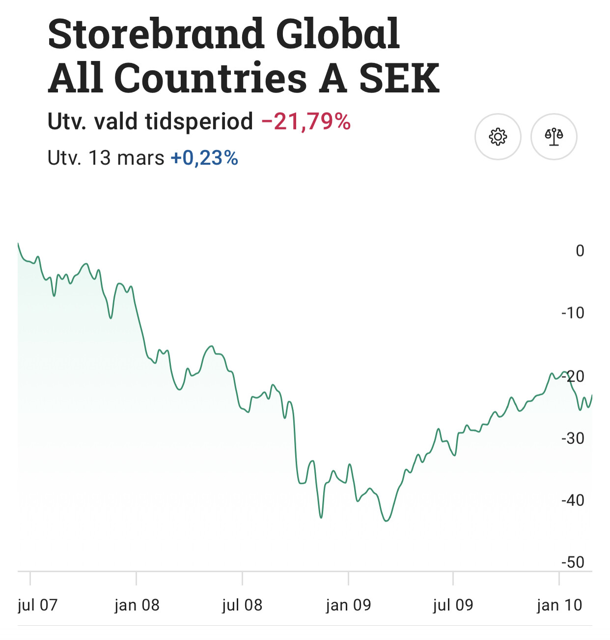 Det är bara att jag tog ett eget avsnitt medan jag klipper in alla de andra i ett annat. Så det har det inte framkommit någon ny forskning de senaste veckorna som säger att man ska spara på ett annat sätt utan det som fortfarande ger bäst sannolikhet för att lyckas i sitt sparande det är att spara långsiktigt regelbundet, automatiskt i en bred, billig global aktieindexfond och så tänka på sparhorisonten och liknande. Egentligen om vi tittar på det nu så det som har hänt är att nu när jag spelar in detta 12 mars så när jag loggade in på Avanza så var det så här Länsförsäkringar Global är typ minus 12% sedan första januari jag tror Lysa är minus 7% sedan första januari och tittar man på en indexfond för Stockholmsbörsen så tror jag faktiskt att den är upp 6-7% och jag tror att det som är lite allvarligt annorlunda nu är ju att ingenting sker i ett vakuum utan den här nedgången om jag ska vara helt ärlig är ganska liten alltså vi pratar minus 10% ish alltså det brukar hända typ 70-80% av alla år att vi har en nedgång.