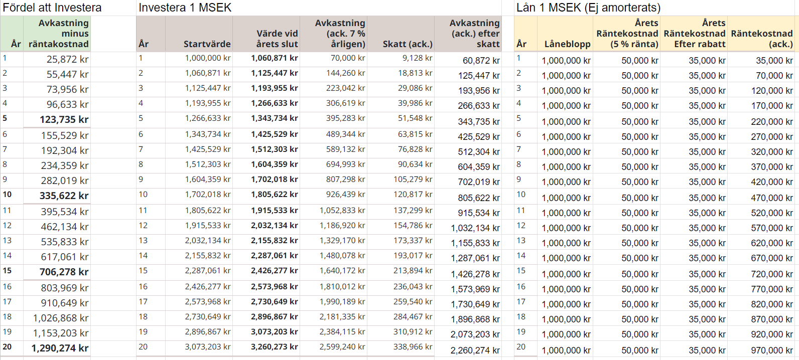 Gjorde en snabb kalkyl på vad man tjänar på att investera 1 miljon (7 % avkastning) istället för att amortera och därmed behålla 1 miljon i lån med tillhörande räntekostander (5 % ränta). Klar fördel till att låta pengarna investeras först och vänta med att amortera.
