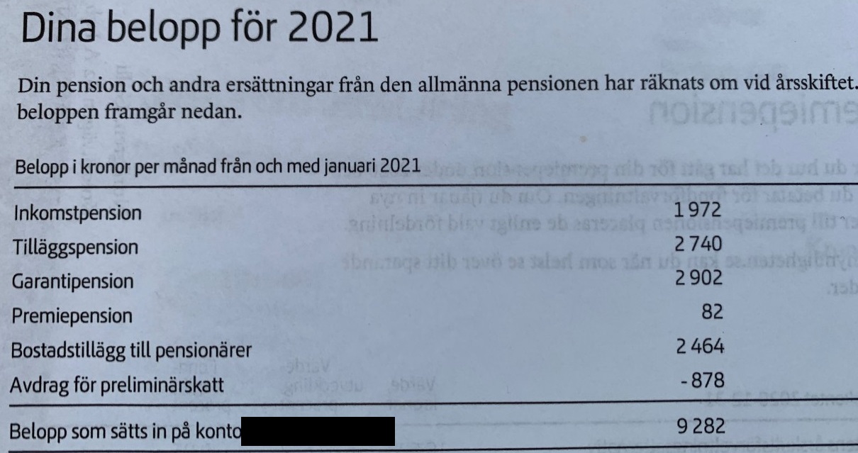 Jag tog mig då friheten att titta på morsans pensionspapper, något jag aldrig gjort innan. Nedan är vad hon får i pension: