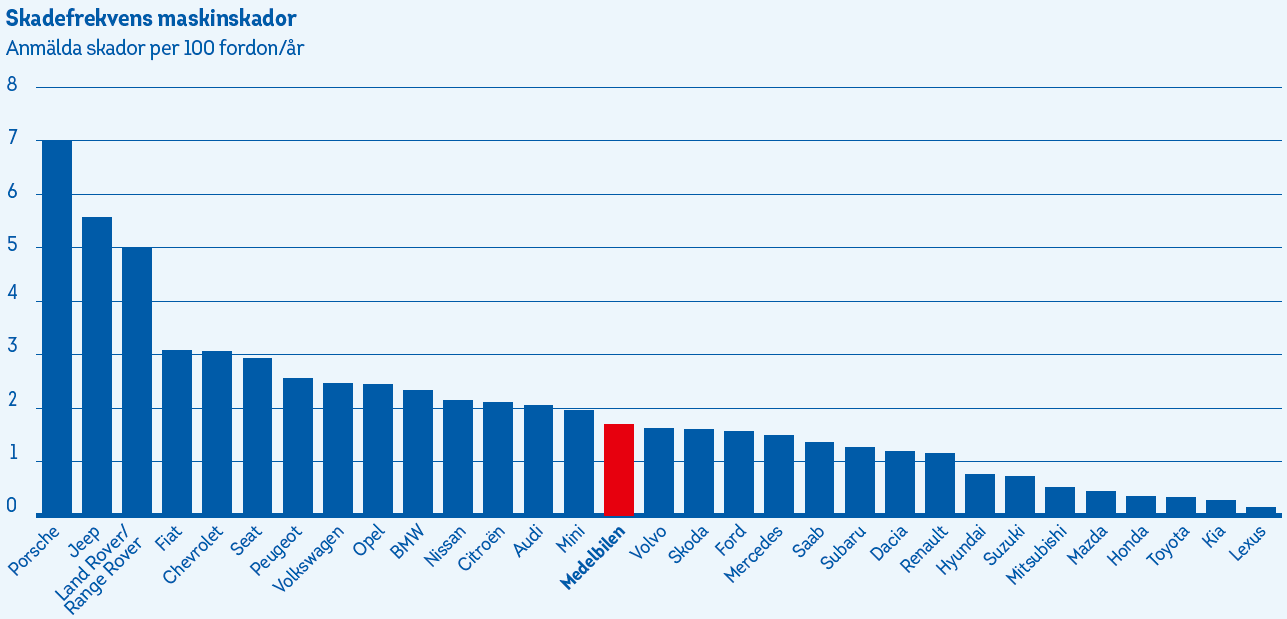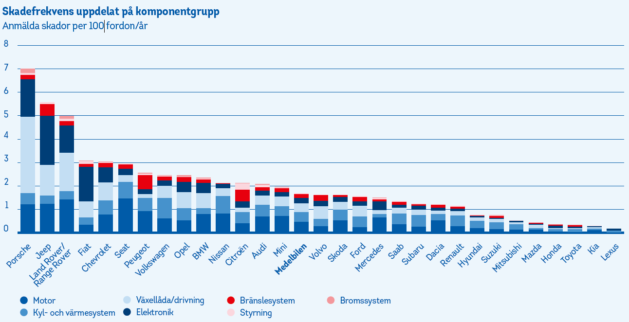 Notera att Porsches felfrekvenser och typ alla “fina” Tyska bilars överstiger ungefär för varje enskilt delsystem var för sig totalen för ALLA delsystems felfrekvens sammanlagt som LEXUS har på sina bilar. Även Toyota och Honda mfl är riktigt bra.
