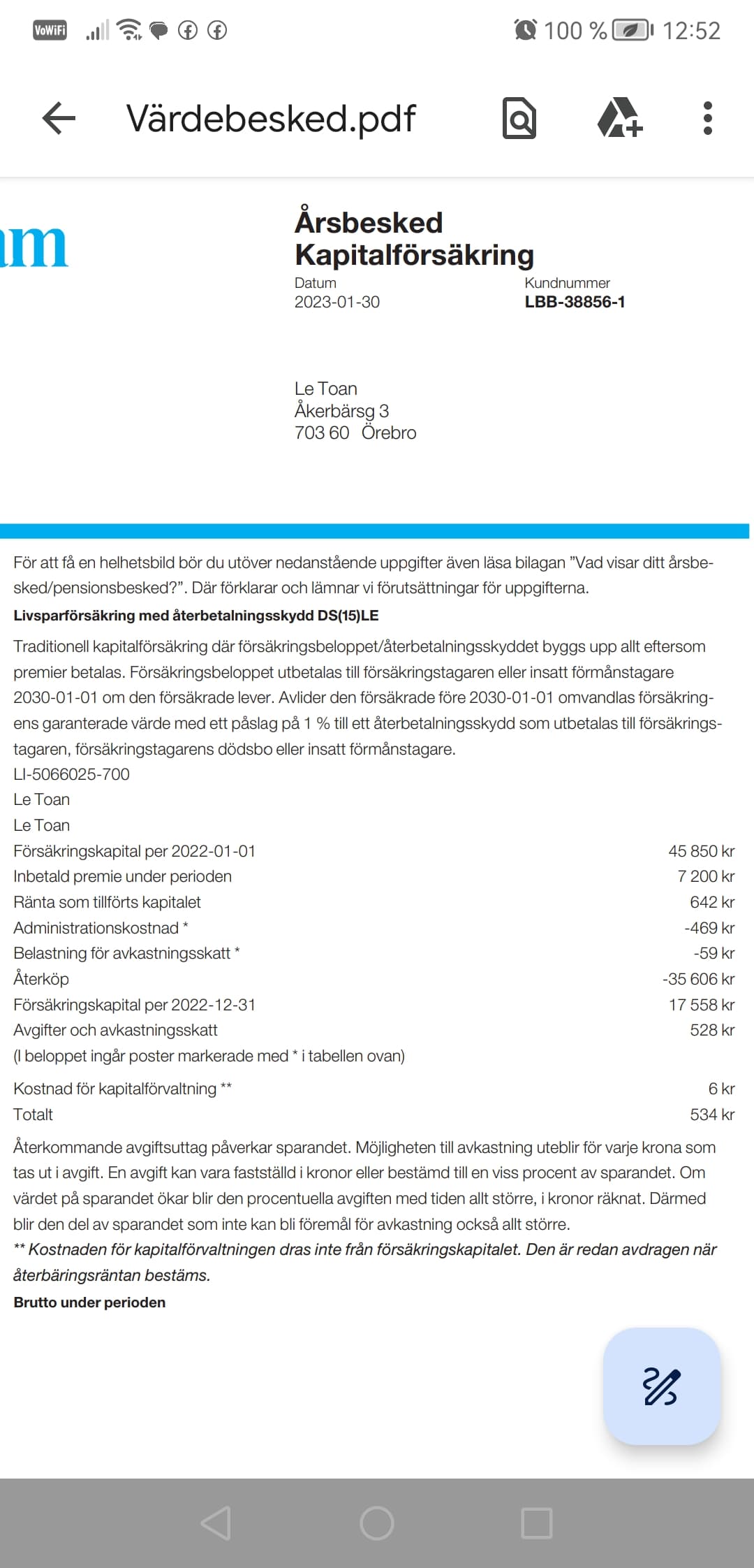 Jag har i ett tidigare inlägg skrivit att jag har en mindre summa, 70 tkr hos Folksam som jag har haft där sen jag var liten. Jag fick rådet här att ta ut dom därifrån eftersom jag inte äger värdepappren bland annat. Jag har idag en garantiränta på 3% och avgiften per år är 288 kr+ 0,7%. Utöver det tillkommer det väl någon avkastningsskatt. När jag ringde Folksam för att ta ut pengarna sa hon att jag hade ett väldigt bra avtal. Garantiräntan gäller endast det beloppet så sätter jag in mer så är det en lägre procent. Jag har möjlighet att ta ut pengarna när som helst och är inte bunden. Skulle inte dessa 70 tkr kunna vara en del av min buffert samtidigt som jag faktiskt får en garanterad avkastning? Vad är nackdelarna? Det är väl betydligt bättre avkastning på kapitalförsäkringen än på ett sparkonto med någon halv procent?