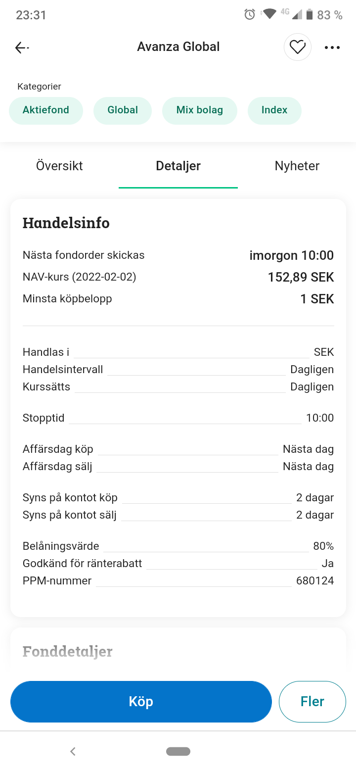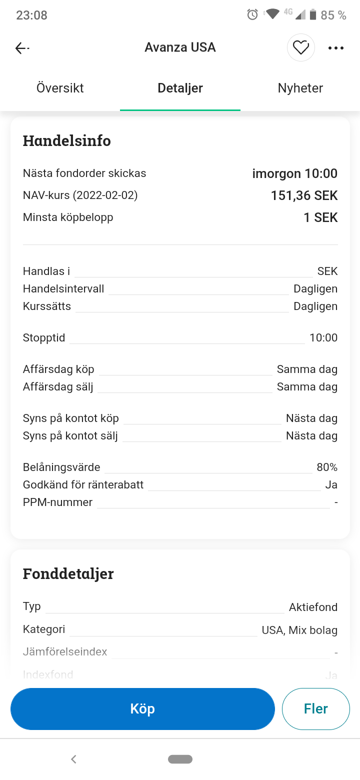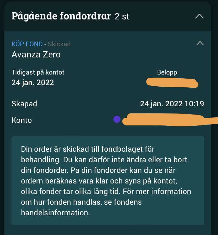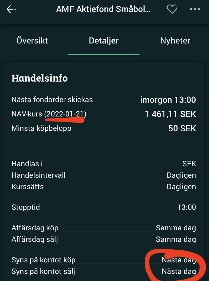 Jag går för säkerhets skull in och kollar på Avanza. Stopptiden är 13:00, affärsdagen samma dag, och på kontot syns det först “Nästa dag”. Ni vet sådär som det står på 80% av alla fonder och som har fördröjningseffekten som jag beskrev ovan. Enda undantaget är ju Avanza Zero som får NAV-kursen satt och handeln genomförd samma dag i och med att det är helt internt. Men JO! Just idag, just denna gång, när börsen gick genom golvet på en enskild dag, så gick fondordern så klart igenom snabbare än det ens står ska vara möjligt. Som om det någonsin händer!? “Syns på kontot” var samma dag, och till kursen från i fredags dvs före mega-raset.