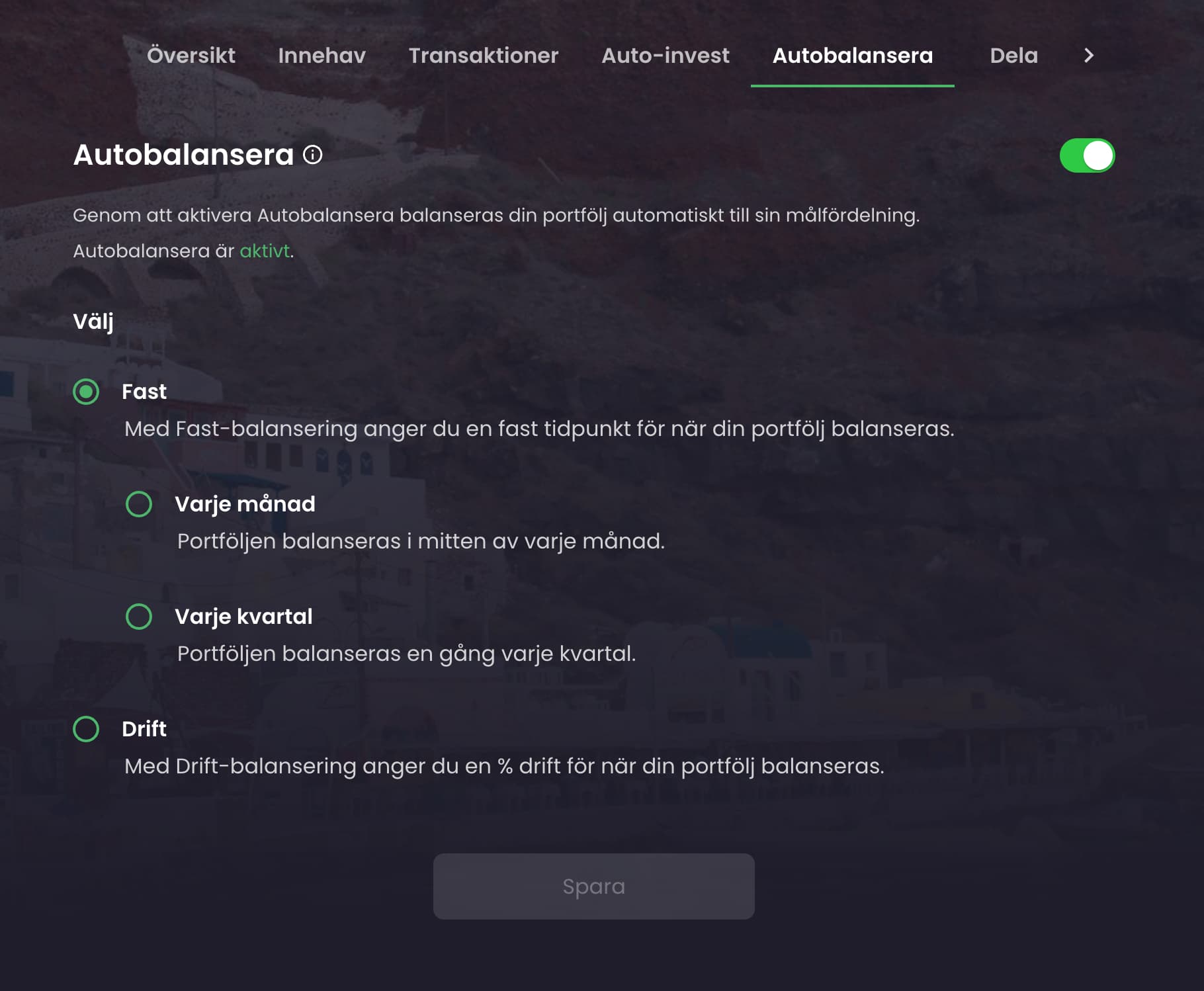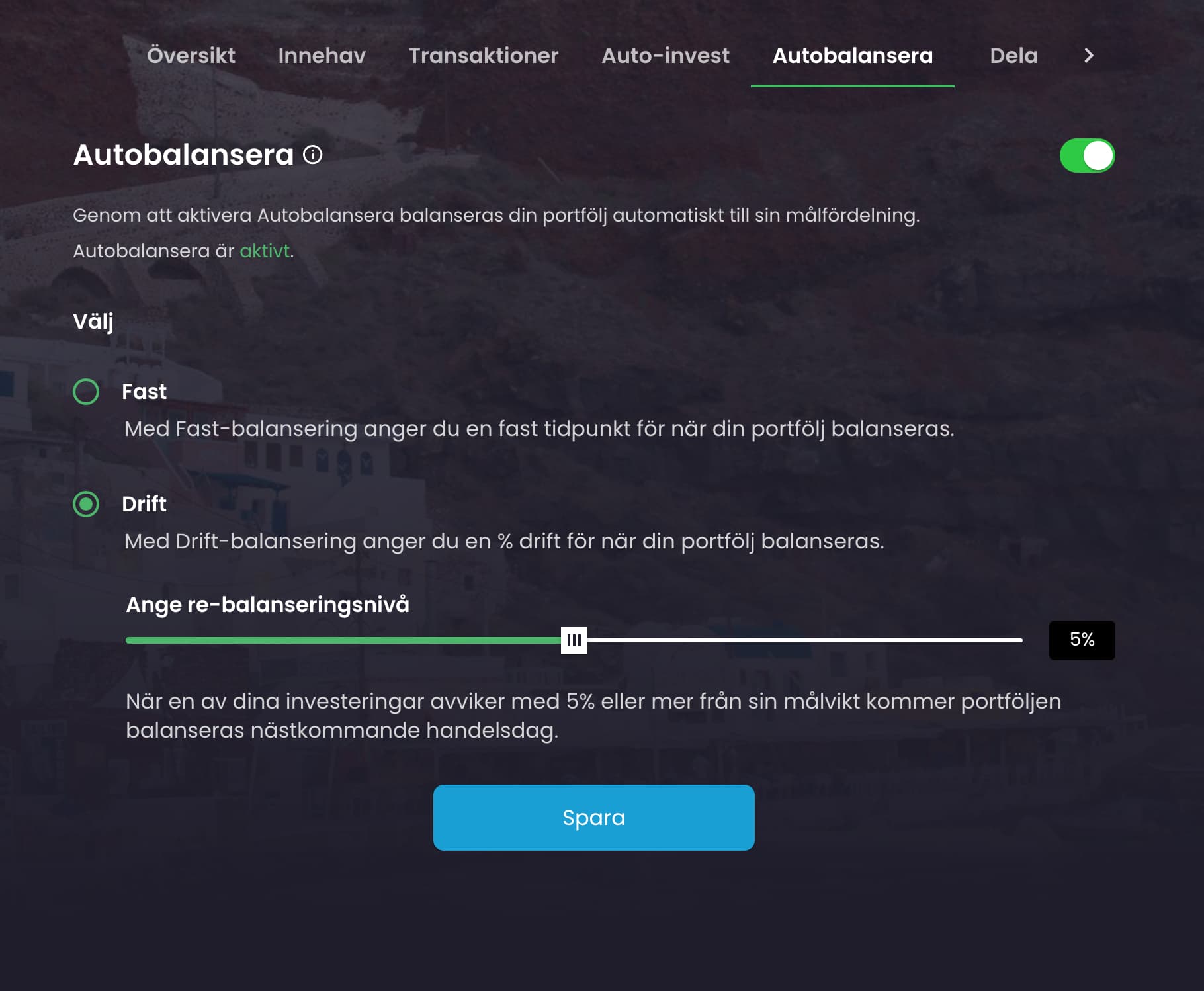 Antingen kunna välja hur många månader det ska gå mellan varje ombalansering eller välja ombalansering vid en viss drift från målfördelning. Eller en kombination av båda.