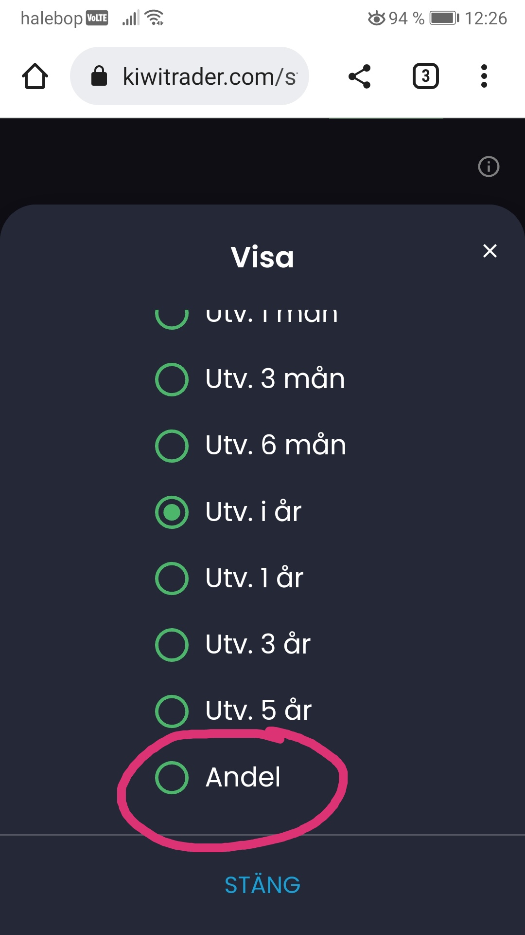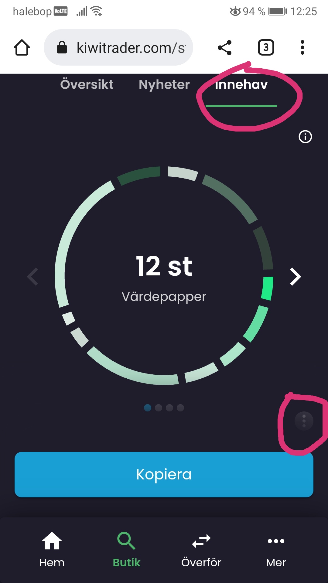 Vill du kolla fördelning i en färdig portfölj från butiken så går du in på den portföljen så får du fram samma meny när du är på innehaven med alternativ när du trycker på de tre prickarna. Välj alternativet som heter “andelar”.