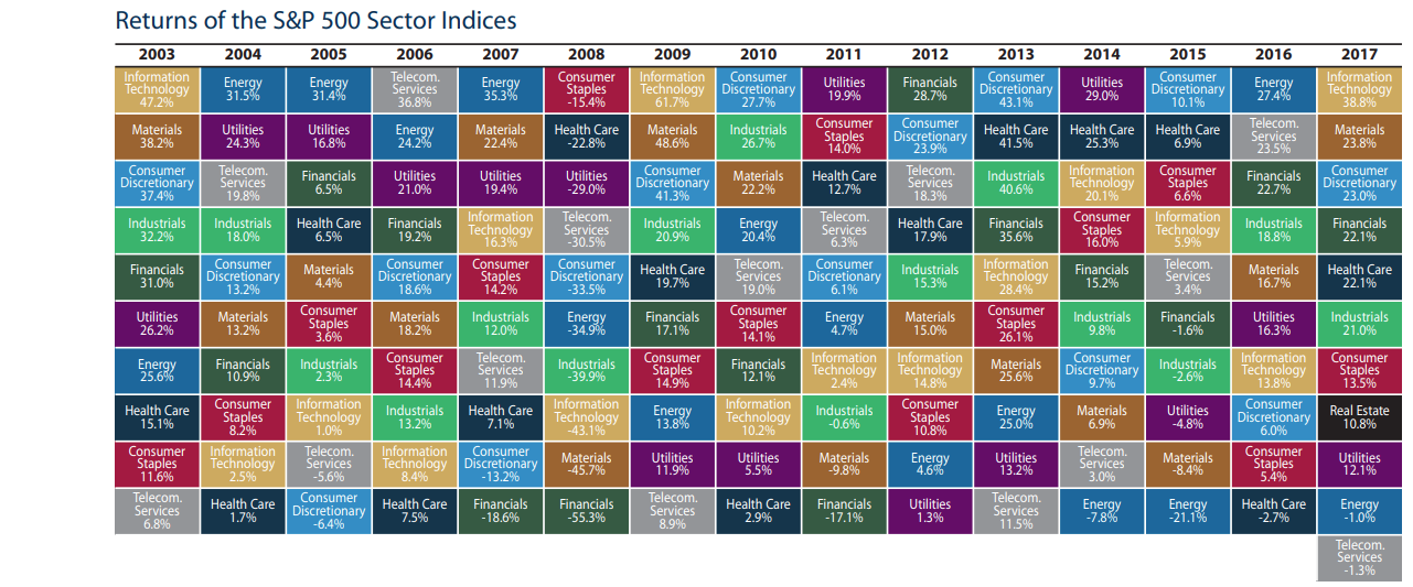 Men vi kan faktiskt se att informationsteknologi och hälsa har haft bäst årlig medelavkastning under denna perioden, så det kanske finns en poäng i att övervikta de sektorerna under olika faser av ens investerarkarriär.