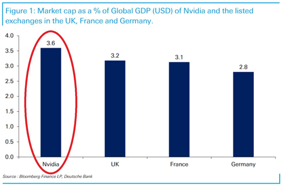 Exempel: Nvidia’s börsvärde motsvarar nu rekordhöga 3,6 % av världens BNP – mer än hela aktiemarknaden i Storbritannien, Frankrike eller Tyskland var för sig.