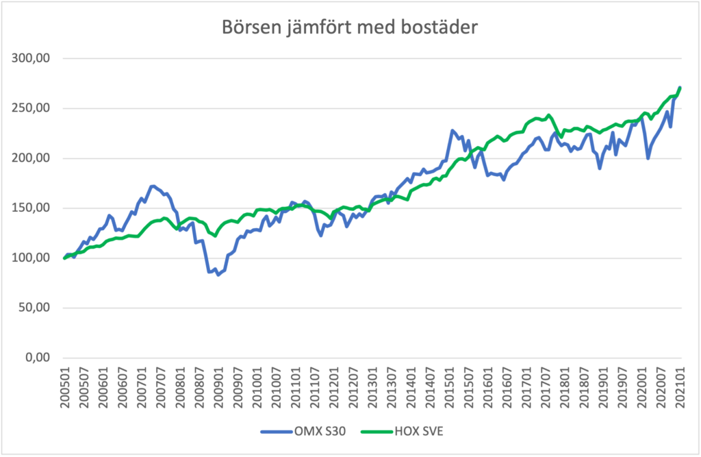 Slutsatsen blir nog att under rådande omständigheter påstå att det är säkrare att investera sitt kapital på Stockholmsbörsens index än att investera i en attraktiv bostad har sannolikt fel. Det är i mångt och mycket samma pengar på samma marknad.