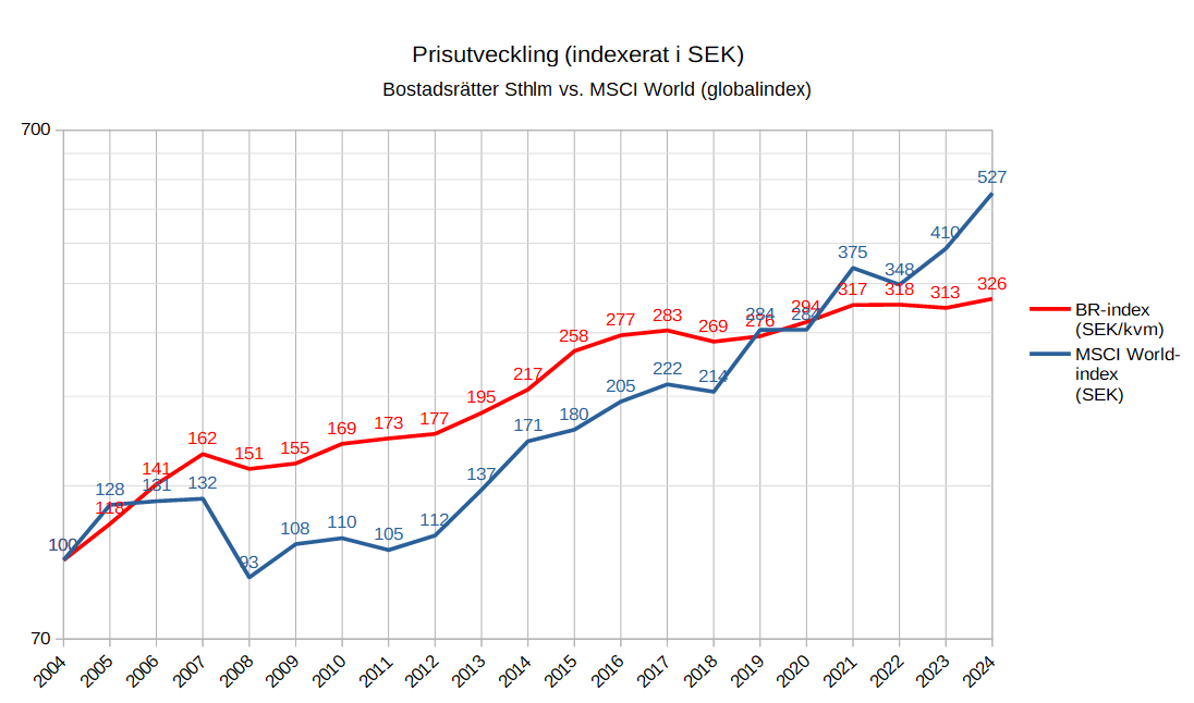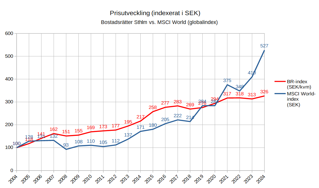 Jag kollade Mäklarstatistik för bostadsrätter i Stockholm (utveckling av kvadratmeterpriset/år) och jämförde med utvecklingen för det globala indexet MSCI World omräknat till SEK. Här nedan är resultatet av jämförelsen. Du får dra dina egna slutsatser. Jag har ingen aning om hur framtiden ser ut.