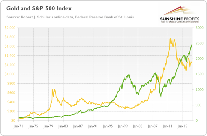 Sen vet jag inte om guld är så stabilt heller. Visst, det har gått bra i år. Men om du tittar senaste 50 åren så vet jag inte om det skulle klassas som mer stabilt än amerikanska börsen (som är majoriteten i en globalfond). I bilden är guld i gult och amerikanska börsen (S&P 500) i grönt.