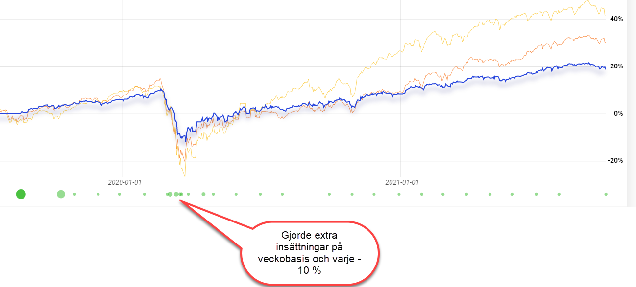 Jag gjorde lite extra-insättningar med lånade medel och ökade aktieexponeringen lite (10 %). Har inte räknat på om det var mer lönsamt eller olönsamt än om jag hade gått in mer. Handlade mest om att psykologiskt göra något.