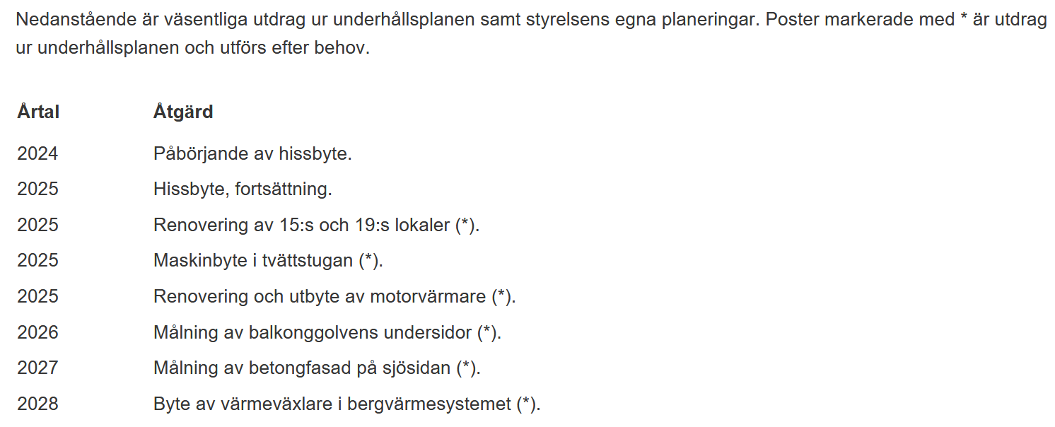 Framtida renoveringar är alltid en risk. De tunga brukar vara stammar (vatten och avlopp), tak, fasad/fönster. Kanske kolla om de har reserver i föreningen för en del eller om allt måste gå mot upplåning dvs höjda avgifter.