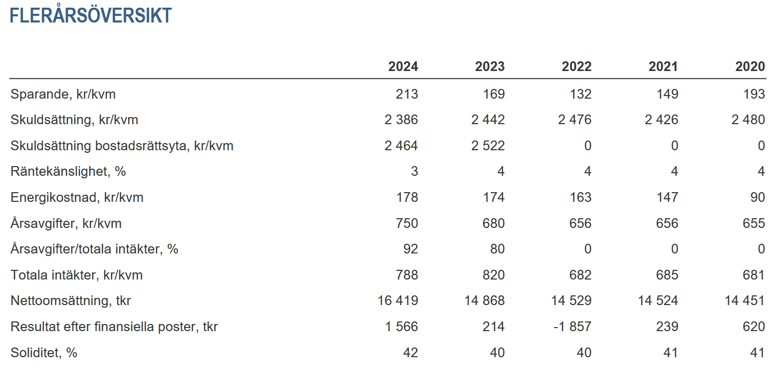 Belåningen är idag relativt låg, 2464kr/kvm, med ett sparande på 213kr/kvm och år. Totala intäkter per kvm ligger på 788kr.