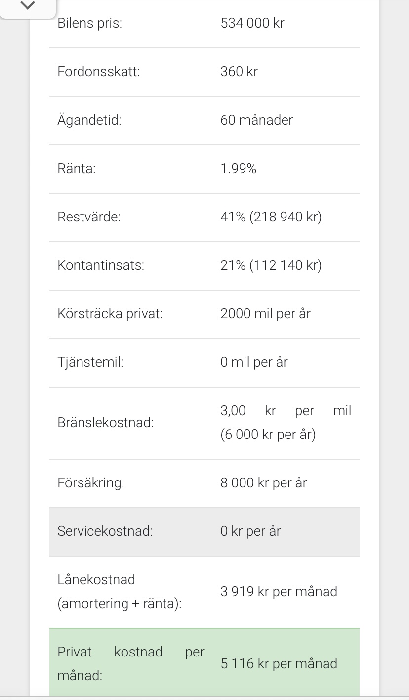 Så med kontantinsatsen utslagen, däck kostnaden utslagen på 60 månader och högre milkostnad landar du närmare 9000 kronor per månad vilket är rimligt.