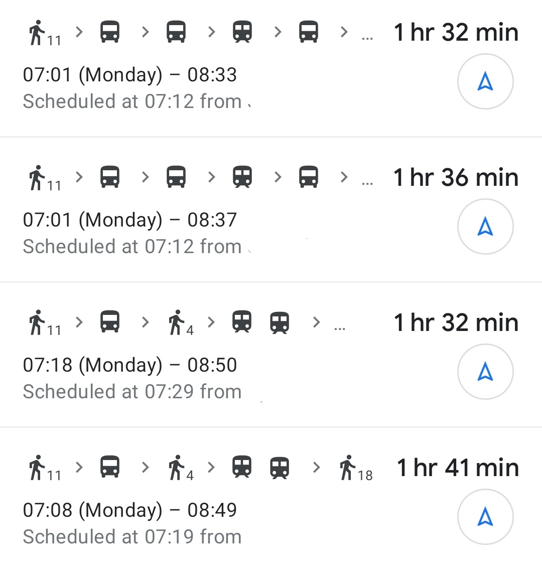 Resa kommunalt tar 90-100 minuter med 3-4 olika bussar och tåg om alla går i tid och inte skapar långa förseningar. Se bild